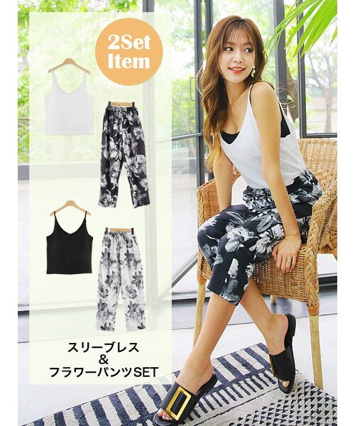 季節感感じられるスリーブレス&フラワーポイントパンツSETの登場! 着やすい2色構成でセットでも 単品でも様々な活用ができます。 シンプルなスリーブレスとウエストゴムの フラワーポイントのパンツが楽でトレンディーです。 大人可愛いシルエットが魅力ポイント! セットで上に薄手のカーディガンを 羽織れば春、秋のトレンディールックにも。 単品でショートパンツや無地の スリムトップスに合わせても良いです。