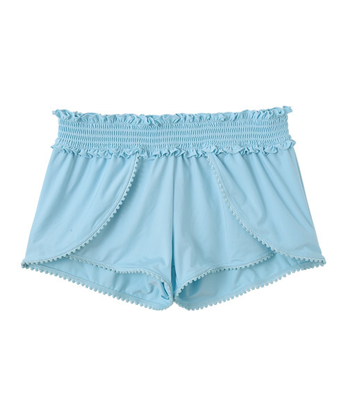 フチにさりげなく小さなポンポンを施した、ビキニボトムの上からご着用いただくショートパンツです。 股上が浅めの、腰で履くタイプのパンツなので、野暮ったくならずに着こなしていただけます。 裾はゆとりを出していますので、太もも周りが気になる方へもオススメです。 水着と同素材で作っていますので、伸縮性があり、動きやすく、またそのまま水の中に入ることができます。 ウエストはゴムシャーリングなので、ゴムを伸ばして履いていただきます。 オリジナルのラッシュガードとの相性も良いです。 ビキニボトムのみでは心もとない方へ、オススメのショートパンツです。 こちらのビキニは上下別売りですので、お好みのビキニコーディネートをお楽しみください。 また全ての水着に、厳選した滑らかで肌触りの良いマットな素材を使用し、その素材を裏表両面に用いることで着心地の良さを高めています。