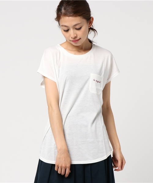 チビポケットでアクセントを付けたTシャツ。長め丈と後ろ下がりのシルエットで今っぽくスタイルカバーできるのがうれしい。シルキー加工でなめらかに仕上げた肌触りの良さもポイントです。