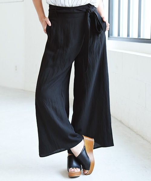 トレンドのスタイリングにマストなワイドパンツ。 ウエストコンシャスなリボンデザインが コーデのアクセントになり、リラックスムードの高い ワイドパンツを落ち着きのある 大人な印象に仕上げてくれます。 レーヨン混の柔らかく 肌馴染みの良い素材で着心地も抜群。 フロントのアシンメトリーな仕様で こなれ感も演出してくれます。 スタイルアップ効果のあるワイドシルエットは 体型カバーにも最適な優秀な1枚です。 ◆素材 柔らかく肌触りの良いレーヨン混素材。 伸縮性なし/透け感なし/裏地あり ◆ケア方法 ・お洗濯の際は手洗いをおすすめ致します。 ・アイロンをお使いの場合は低温(80℃〜120℃)でご使用ください。 ◆注意事項 *撮影場所やイメージにより 実際の商品と色味が若干異なる場合がございます。 商品のお色味はカラーバリエーション画像をご参照ください。