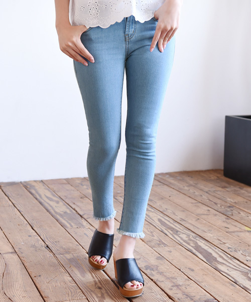 <価格改定のお知らせ> 2018年3月27日より価格改定があり、価格を変更して販売しております。 レッグラインに沿うスキニーシルエットが ポイントのデニムパンツが登場。 カットオフの裾が今年らしいこなれ感を演出。 裾幅が狭めなので足首をすっきりと見せてくれ、美脚効果大。 伸縮性に優れたストレッチデニムで、 窮屈感が軽減されて動きやすいお作りに。 裾のフリンジをそのまま見せて穿いたり、 ロールアップしてクロップド丈で穿くのもオススメ。 トップスとのバランスに合わせて着用ください♪ ◆素材 ストレッチがたっぷり効いたデニム素材。 伸縮性あり/透け感なし ◆ケア方法 ・お洗濯の際は手洗いをおすすめいたします。 ・お洗濯後は日陰の吊り干しをおすすめいたします。 ・アイロンをかける場合は低温で当て布をご使用下さい。 ◆注意事項 *撮影場所やイメージにより 実際の商品と色味が若干異なる場合がございます。 商品のお色味はカラーバリエーション画像をご参照ください。