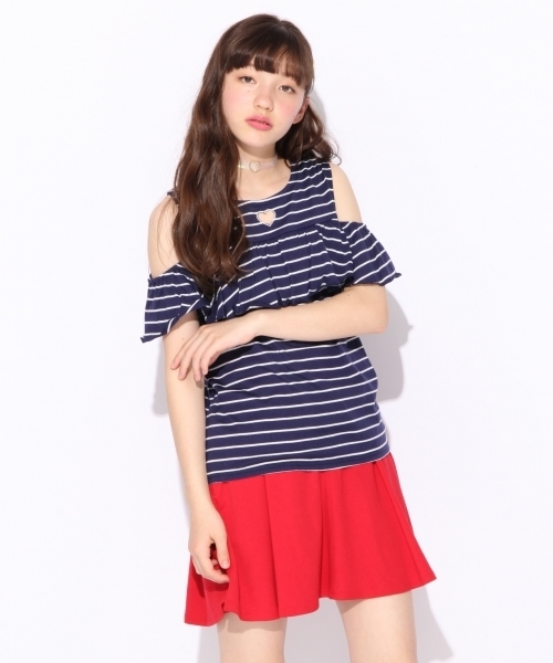 カタアキ×ハートアキデザインがとってもかわいいTシャツ! ガーリーになりすぎないボーダー柄でおしゃれ見え◎ ほどよい肌みせで、これからの季節にぴったり! 伸縮性のある柔らか素材を使用しているので、着心地がいいのもうれしいポイントです☆ ボトムスを選ばないから、どんなコーデとも相性バツグン! ※サイト上のカラー名と、お届け商品に記載されているカラー名が異なる場合がございます。