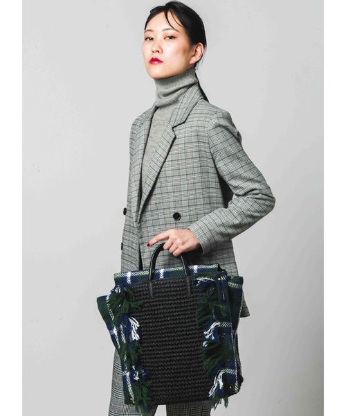 【LAUGOA(ラウゴア)】 秋冬らしいチェック柄の生地と、ペーパー編みのボディを組み合わせた新しいバッグ。一つ一つ手作業で丁寧に仕上げられたボリューム感たっぷりのフリンジが歩くたびに軽やかに動き、モードな存在感とラフな雰囲気を醸し出します。異素材の組み合わせ方はLAUGOAだからこそできる技。またA4サイズや長財布も楽に入る大きさながら、軽くて持ちやすいのも魅力的の一つ。いつものスタイリングもまた違った表情にみせてくれます。