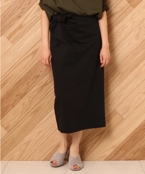 きゅっと結んだ大きなリボンでウエスト部をしっかりマークした、大人可愛いミディアム丈のスカート。広がりすぎないタイトシルエットで、落ち着いた印象を持たせつつ、女性らしいスタイリングを演出してくれます。バックの裾には肌が見えにくい深めスリット入りで、シルエットを奇麗に保ながらも足裁きは快適です。裏地有りです。