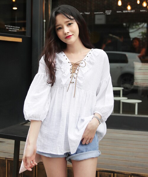 胸元のフリルラインとふんわりボリューミーなフォルムでフェミニンムードたっぷりに仕上がったブラウス♡フロントのレースアップデザインがトレンディかつセクシーなポイントに!ミニ丈のボトムとバランスよくスタイリングするのがおすすめ☆ ※WEARに記載してある金額と、DHOLIC通販サイトに記載してある金額にシステム都合上、稀に誤差が生じます。正しい金額はDHOLIC通販サイトに記載された金額です。