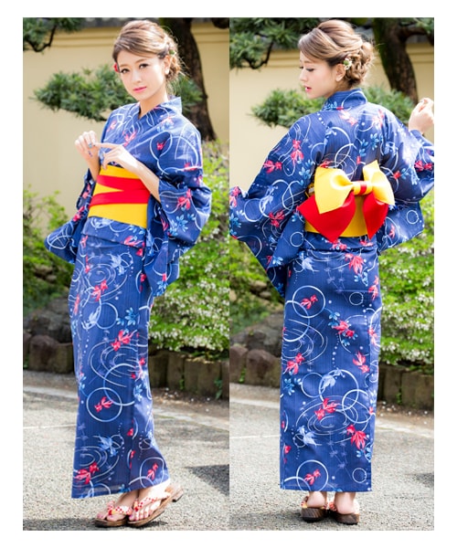 ゆらゆらと泳ぐ金魚が上品で涼しげな浴衣。夏の大定番、浴衣と帯+下駄の3点セットアイテムです。全体に色鮮やかな金魚を全体にあしらい、流水紋で女性らしい落ち着いた印象に。簡単に着付け可能な造り帯は、つけるだけでワンランク上のボリューム感ある帯結びで後ろ姿にも差をつけてオシャレ度アップ◎。サラッとした肌触りで、着心地も抜群です。お気に入りのアクセや巾着かごバッグなどとコーデすることで、より自分らしい浴衣スタイルに。お祭りや花火大会など夏のイベントには欠かせないファッションアイテムです。【セット内容】浴衣、造り帯、下駄※モデル着用のヘア小物は参考商品です。セットに含まれません。