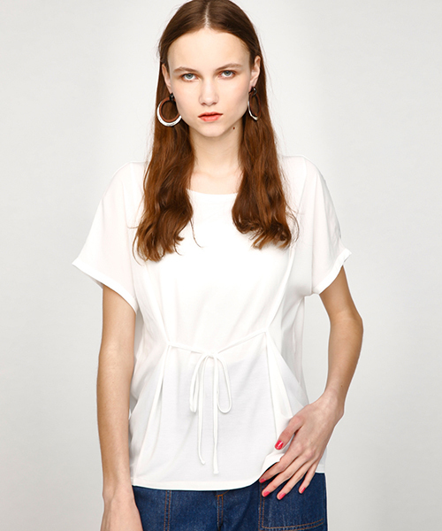 【WAIST DESIGN CHIFFON TOP】シフォン切り替えと、フロントのリボンが女性らしい印象。少し長めの袖丈と、ボタンのディティールは腕をすっきり見せてくれます。晩夏らしいダークカラーの展開にも注目。