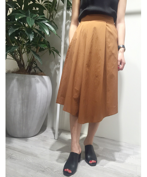 ドライタッチの清涼感ある素材感が特徴。しわになり辛いのもうれしいポリエステル素材。ベルト後ろにはゴムが入り、気負わず着用できます。一枚仕立てで軽く、大きく入れたアシンメトリーデザインタックが身体のラインを細く魅せてくれます。インもアウトもし易いすっきりとしたデザイン。