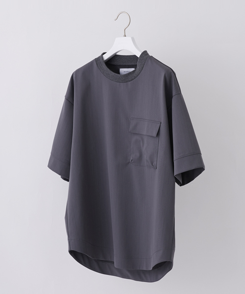 『シャツ感覚で上品に仕上げたプルオーバー』Tシャツながらシャツのようにきちっとした見え方を意識した1着。【Fabric】 スーツ地に使われるような上質なポリエステルウール素材を使用。やや光沢のある高級感漂う表情。ストレッチも効いており快適な着心地。【Design】ゆったりとしたサイズ感に仕上げ、肩を落としたリラクシングなシルエット。立体的な大きめのポケットと随所のシャツディティールがポイント。襟は微配色のリブで程よくアクセントに。Tシャツ感覚で着ることが出来、だらしなく見えないお薦めの1着。