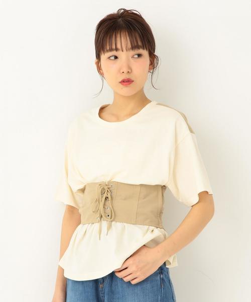 トレンドのコルセットベルトをつけたようなTシャツ。 ウエストをきゅっと絞ったデザインは 夏定番のTシャツスタイルもラフになりすぎず 今年らしい着こなしに。 フロントはカットソー、バックは布帛の生地で切り替えて 表情に変化をプラス。 ※着用、お取り扱いの際は商品についておりますアテンションタグ、洗濯ネームを必ずご確認ください。 店舗へお問い合わせの際は、全国のAnother Edition 各店舗まで下記の品名/品番をお申し付け下さい。 品名:AECM C/N キリカエ CORSET TEE 品番:5617-199-3116