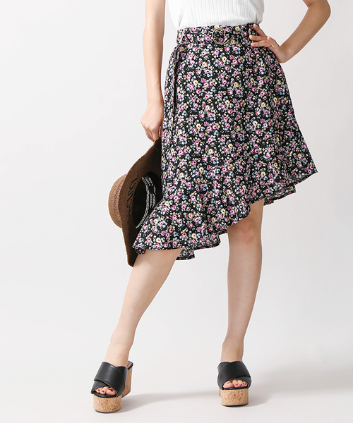 アシンメトリーなデザインで仕上げたスカート。あえてアンバランスにしたデザインが、手軽に着こなしのアクセントになります。 広がり過ぎないスマートなフレアシルエットで、カジュアルな素材ながらもフェミニンな雰囲気も持ち合わせたアイテム。バックウエストはゴム仕様で、リラックスして快適に着用頂けます。また、共布で作られたベルトは取り外し可能なので、お持ちのボトムスと組み合わせることでコーディネートの幅も広がります。 今季はショート丈トップスと合わせたり、ベレー帽やチョーカーなど、小物で遊びを効かせたコーディネートもオススメです。