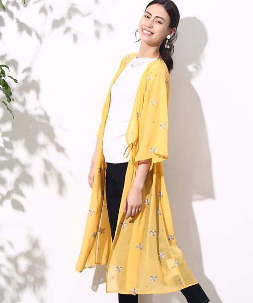 エスニックな雰囲気の刺しゅうが新鮮。羽織るだけで旬スタイルを叶えるエアリーなガウンさらっと羽織るだけで、スタイリングを旬顔にアップデートするガウン。 柔らかく薄手の素材感ならではの、エアリーなシルエットが女性らしさを引き立てます。 クロスステッチであしらったフラワー刺繍で、ほんのりエスニックムードをプラス。 ウエストにはドローコードを施しているので、軽くブラウジングしてシルエットの変化を楽しむのもおすすめ。