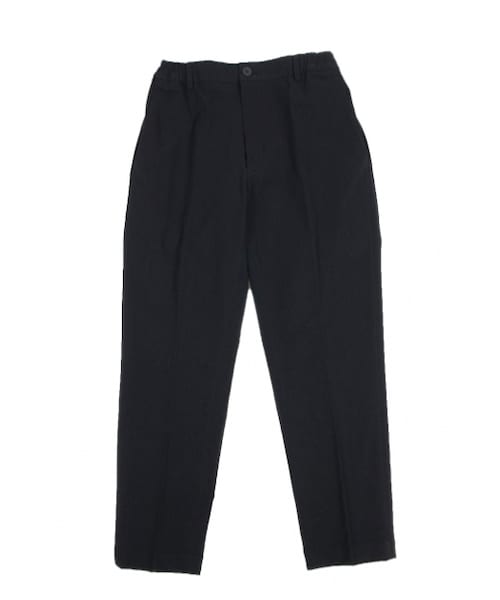 【Sports Slacks】 毎シーズン人気のスポーツモデルのスラックス。今シーズンはD/NAVYとBLACKの、メンズ好みなカラー展開。ワタリがあり裾に向かってユルくテーパードの効いたシルエット。フロントのサイドからバックのウェストがゴムなのもノンストレスで履きやすい。軽くて涼しい素材で、足を曲げ下げしても崩れないシルエットも特徴。夏場に持ってると使えるボトムです。[material]100% Polyesterサイズ0 (ウェスト70~80cm ヒップ96cm わたり30cm 股下62cm 裾巾17cm)1 (ウェスト75~85cm ヒップ106cm わたり32cm股下64cm裾巾18cm)