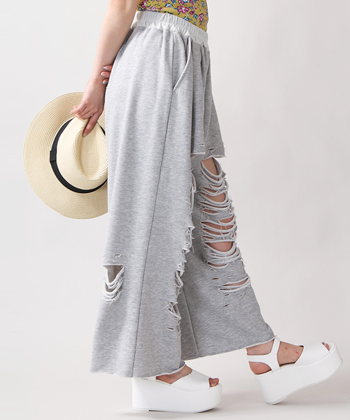 フロントにクラッシュ加工を施したスウェットパンツ。大胆なクラッシュ加工が、手軽に着こなしのアクセントになります。ウエストはゴム仕様なので、リラックスして快適に着用頂けるひと品。シャツやブラウスは勿論、カジュアルなスウェットなどベーシックなトップスと合わせるだけで、普段と違った印象に仕上がります。今季はショート丈トップスと合わせたり、ネオンカラーの網タイツなど、小物で遊びを効かせたコーディネートもオススメです。
