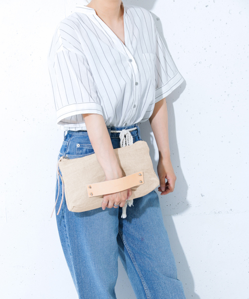 ナチュラル素材のクラッチバッグ。 柔らかい素材でクラッチにはもちろん、旅行用ポーチやセカンドバッグにも◎ レザーは牛革を使用しているので、使うほどに自分仕様になっていくのが嬉しいポイント。 ※長時間日光に晒したり光熱のライト等に当てると変色、破損の恐れがあります。 ※持ち手を強く引っ張ったり、物の詰め込み過ぎや極めて重いものを入れて使用しないでください。破損の原因となります。 ※その他お取り扱いに関しましては、商品に付属のアテンションタグをご覧ください。