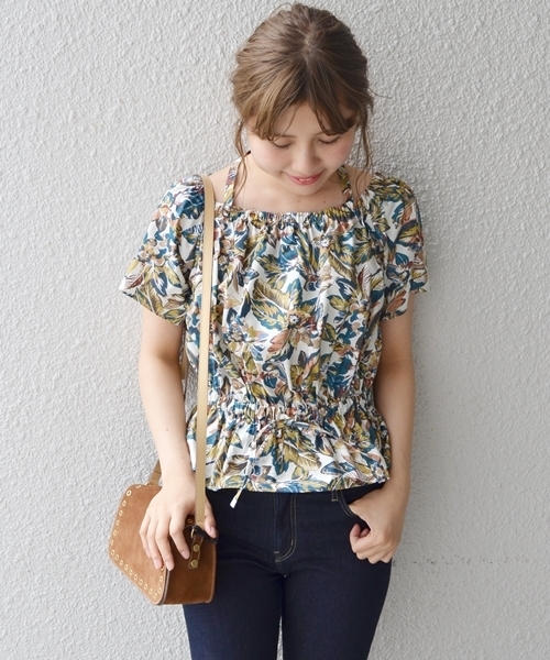 鮮やかなフラワープリントが目を引くブラウスです。ウエストにはゴムがはいっており、すっきりとした今年らしいシルエットに。首元には取り外し可能なホルターネックも付いており、印象を変えてお楽しみいただけます。夏らしくオフショルダーではもちろん、露出に抵抗のある方は首元まであげれば普通のブラウスとしてもご着用いただける優れもの◎。一枚で決まる主役級アイテムです。 ※過度な力や摩擦が加わると、縫い目の滑脱、生地の擦り切れや破れ、生地の変形が生じますので十分にご注意ください。 ※日光や蛍光灯などに長時間当たると色褪せします。保管時は窓際を避けてください。洗濯後は直射日光を避けて必ず陰干しをしてください。 ※末永く愛用頂く為に、アテンションタグ・洗濯ネームを必ずご確認の上、着用又はお取り扱い下さい。