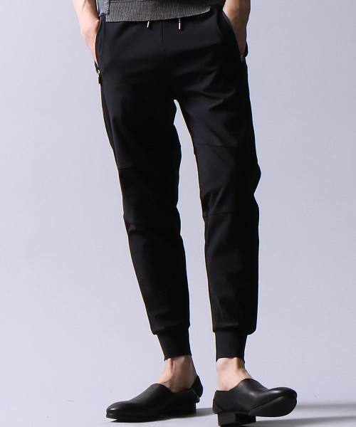 メリルナイロンというマイクロファイバー糸を使用し、ハイゲージに編み上げたトリコット素材です。キックバックに優れ、肌に触れた時の快適性が特徴です。90年代のスポーティーな感覚を取り入れたラインが特徴のジョグパンツになります。