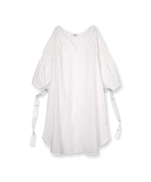 ふわっとしたボリューム感がリラクシーな雰囲気。肌触りも良く暖かい季節でもサラリと着ていただけます。 袖にほどこしたコットンレースがポイント。ふわりと広がる袖のシルエットが女性らしさを引き立たせてくれます。 セットで取り外し可能なヒモで、少し上めのウエストマークでスタイルアップも。 少し肩を抜いてきて頂くと一気にこなれ感のあるスタイルに仕上がります。 前を開きパンツスタイルの上に羽織るのもおすすめです。