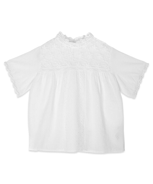 デコルテ、切り返し、身頃に異なるレースを使用した贅沢なブラウス。 それぞれ表情の異なるレースをミックスしながらも、単色のため落ち着いた雰囲気に。 ボトムスにinしてもしなくても着て頂ける丈感です。 綿100%でさらりとした着心地も◎