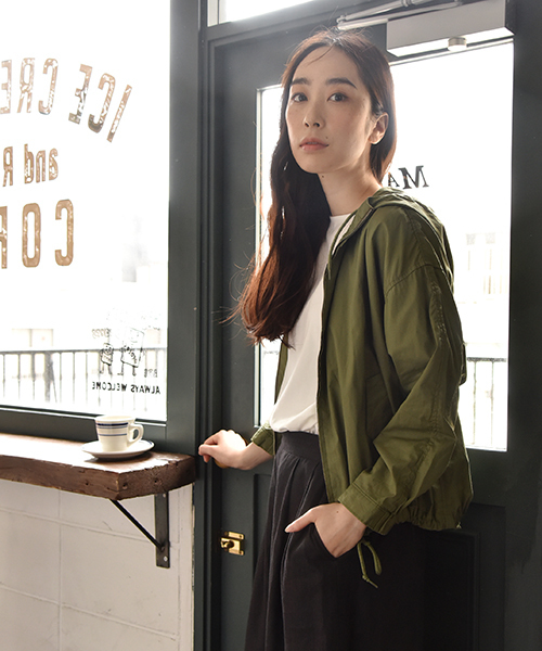 パリっとシャツ感覚で羽織れるマウンテンパーカー すっきりとしたフロントはボトムスを選ばず、 ボリュームのあるバックスタイルは腰回りをしっかりカバー。 張りのあるシャツ素材と、さりげないスポーティーなディテールはフェミニンなトレンド感のアクセントに。
