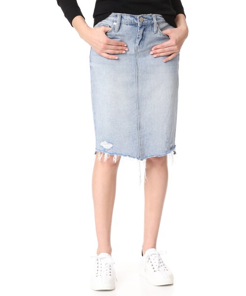 A stonewashed Blank Denim skirt with a classic pencil profile and shredded holes at the back hem. 5-pocket styling. Button closure and zip fly. Fabric: Denim. 100% cotton. Wash cold. Imported, China. Measurements Length: 22.75in / 58cm Measurements from size 27