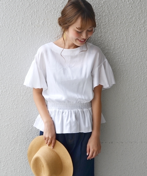 フレアな袖とぺプラム型が女性らしいブラウスの登場。パンツ合わせでシルエットを綺麗に見せるのがおススメのコーディネートです。これからの季節に一枚で着れるデザイントップス♪ ※末永く愛用頂く為に、アテンションタグ・洗濯ネームを必ずご確認の上、着用又はお取り扱い下さい。