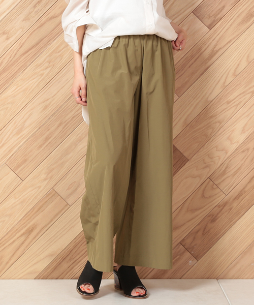 ゆったりワイドで涼しげなデザインのパンツです。 ウエストはギャザーが均等に出るような仕様になっており、トップスインスタイルもキレイにきまります。 適度な光沢とハリ感のあるタイプライターの生地が心地よく、履き心地抜群です。 ベーシックなブラックとカーキの他、オレンジは夏のコーディネートの差し色としてオススメです。