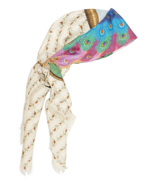 Gucci's scarf contrasts the vibrant plumage of a peacock, with more classic floral vines against a cream backdrop. This piece is spun from lustrous silk and bordered with fringed trims. Style it around your neck, or as a headband.