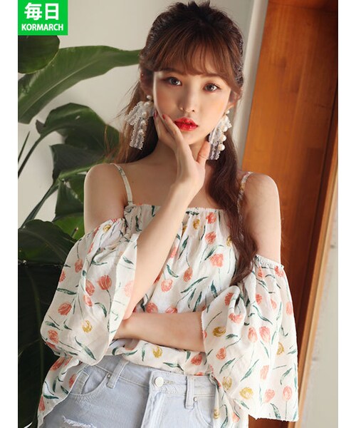 オープンショルダーなのに、トレンディなワイド袖の落ち感で細身効果あります。 裾にも広がりをもたせてあり、 モデルのようにショットパンツにも似合うし、 スキニパンツともよくお似合い。