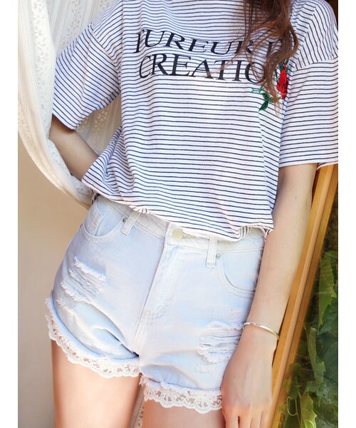 太もも周りにレース飾りを入れてガリーなムードのショットパンツ。 ヒップラインを覆うフィット感もよく、 ハイウエストに加え短い股下の レース飾りでスタイルもアップ。