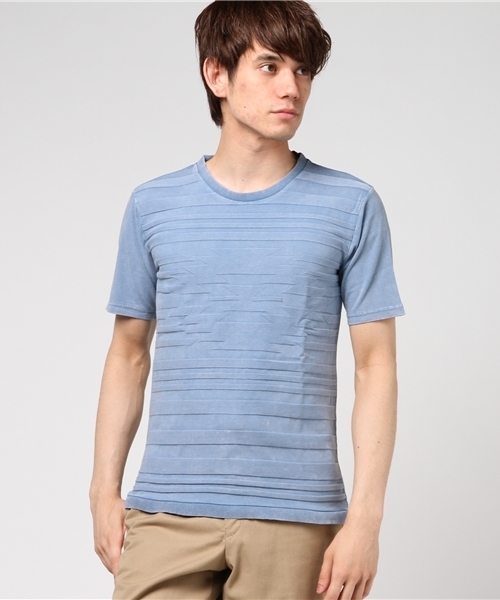 ジャガード織りの凹凸で柄を表現したオルテガ模様のTシャツ。引き続き注目のネイティブ柄ですが、いかにもなデザインが苦手な方や、大人っぽく取り入れたい方におすすめですよ!夏らしい爽やかな色を揃え、一枚でも季節感アップ♪無地T感覚で取り入れたい個性派顔なオルテガTシャツです。[クリーニング]洗濯機洗い可(非常に弱く)ドライクリーニング可(F)