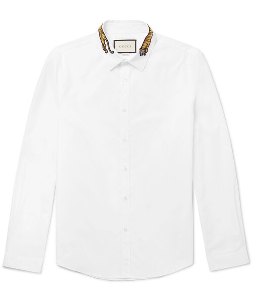 Wild cats have always been a theme in Gucci 's collections and this cotton-poplin shirt is detailed with an embroidered tiger appliqué that sits proudly across the collar. The slim fit ensures it sits neatly under a blazer. Fits true to size. Take your normal size This shirt has a slim cut, but is designed to be not too fitted Comfortably fits those with broad shoulders White cotton-poplin Appliquéd classic collar, buttoned cuffs Button fastenings 100% cotton Dry clean Mother-of-pearl: New Caledonia Made in Italy