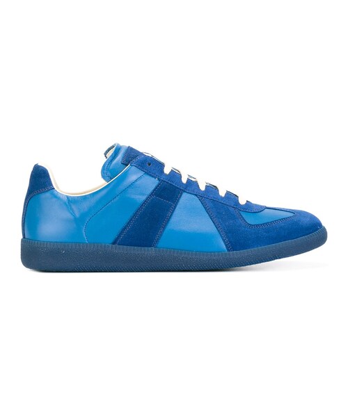 Maison Margiela(メゾン・マルジェラ)の、Replica スニーカー(ブルー)。ラウンドトゥ、スエードのパネル、背面にシグネチャーデザインのホワイトステッチ入り、足首にパッド入り、タン部分にロゴパッチ付き、紐で結ぶタイプ、フラットなラバーソール。レザー製。