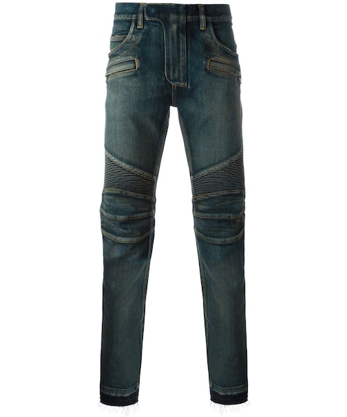 Balmain (バルマン)の、クラシック バイカージーンズ(ブルー)。留め具が隠れるコンシールタイプ、ベルト通し付きウエストバンド、リブ編みのディテール、ダメージ加工、ストーンウォッシュ加工。ストレッチコットン製。