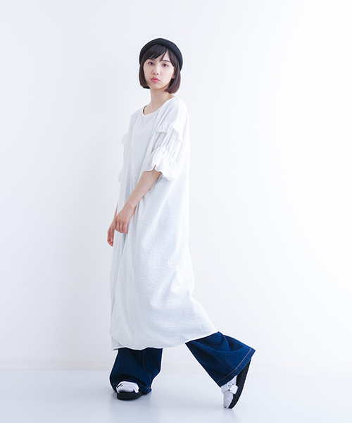 大きめシルエットが今年らしいワンピース。袖部分は連なったフリルになっており、シンプルなデザインながらもアクセントになってくれます。 そのまま着るのも可愛いですが、デニム地のワイドパンツなどとあわせたレイヤードもお洒落に仕上がります。 キャップやスポーツサンダルなどと合わせて楽しんで◎