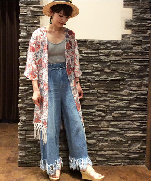 今年絶対手に入れたい花柄ガウン! エスニック要素を盛り込んだフラワープリントなので、トレンドのガウンコートでもワンランク上のスタイルが完成します♪ 着こなしに動きを加える長めのフリンジ付き! セットのリボンでウエストマークもできますよ! [クリーニング] 手洗い可ドライクリーニング可(F)ウェットクリーニング(W)