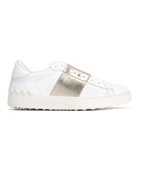 Valentino(ヴァレンティノ)の、Valentino Garavani Open スニーカー(ホワイト&ゴールドトーン)。ラウンドトゥ、レースアップフロント、シューズのタンにロゴ、ピラミッド型スタッズ、ノンスリップソール、ゴールドトーンのライン。カーフレザー製。