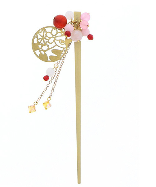 揺れる飾りが華やかなかんざしです。 プレート飾りもついていて、どこかレトロでモダンな雰囲気。普段のお着物や浴衣に。 ※かざり部分は繊細ですので、強い力が加わらないようにお気をつけください。まとめた髪に挿してご使用ください。 【商品内容】髪飾り1点 【カラー】 ブルー・・・青、水色などの石、ビーズ。 イエロー・・・オレンジみの黄色、黄色、赤色などの石、ビーズ。 レッド・・・赤、ピンクなどの石、ビーズ。 かんざし部分はマットなゴールド。ゴールドのプレートは桜楓に猫模様。 ※天然石を使用しておりますので、色合い等には個体差がございます。また、ご覧いただいている環境によって、色みが若干異なって見える場合がございます。 ※商品によってサイズが若干前後する場合がございます。