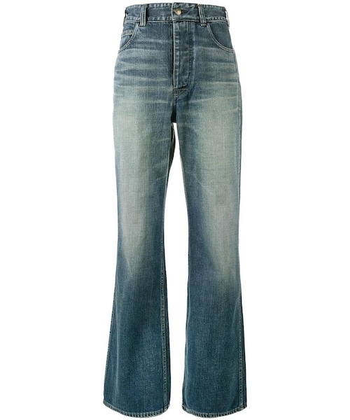 Visvim(ヴィズヴィム)の、Social Sculptress フレアジーンズ(ブルー)。ハイウエスト、ベルト通し付きウエストバンド、ボタン&ジッパーフライ、ファイブポケットデザイン、ストーンウォッシュ加工、フレアースタイル。コットン製。