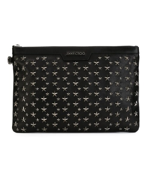 Jimmy Choo(ジミー・チュウ)の、Derek クラッチ(ブラック)。トップファスナー、シルバートーンのロゴプレート、シルバートーンのロゴプレート、シルバートーンのスタースタッズ装飾、内側にジップ付きポケット、内側にロゴパッチ、内側にコンパートメント、迷彩柄の裏地。レザー製。