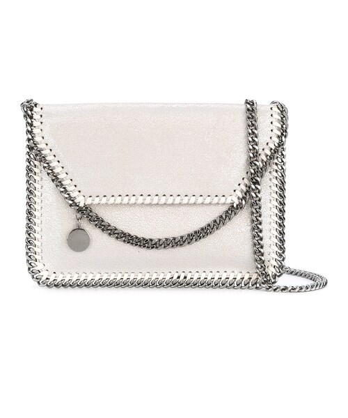 Stella McCartney(ステラ・マッカートニー)の、Falabella ショルダーバッグ ミニ(オフホワイト)。チェーン装飾を施したトリム、チェーンのショルダーストラップ、フォールドオーバー、ロゴ入りの裏地、内側にロゴパッチ、刻印ロゴ入りチャーム。フェイクレザー製。