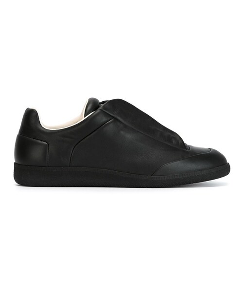 Maison Margiela(メゾン・マルジェラ)の、コンシールレース スニーカー(ブラック)。ラウンドトゥ、レースアップフロント、足首にパッド入り、切り替えしの縫い目を付けたディテール、フラットなラバーソール。カーフレザー製。