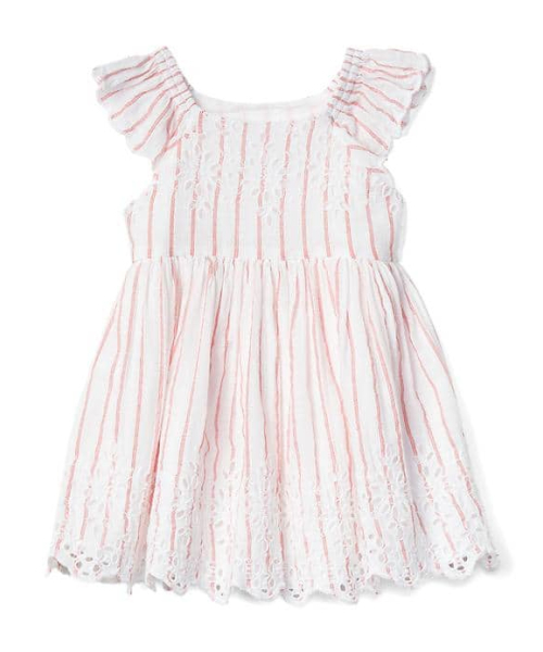 滑らかなコットンの織り地、半袖フラッタースリーブゴム仕様のスクエアネックネックラインと裾にアイレットのディテールウエストのシャーリングがボリューム感をアップストライプの総柄おむつカバー付き*商品タグに記載の価格とサイト上の販売価格が異なる事があります。