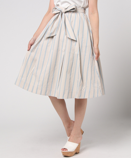 裾に向かって広がるフレアシルエットがエレガントに映えるフレアスカートです。 ポイント力のあるウエストリボンはスタイルアップ効果も期待できそう。 裏地付なので透ける心配もありません。 ウエスト後部分はゴム仕様なので、締め付け感なく着用できるのもうれしいポイント。 ※撮影環境により、光の当たり具合で色味が違って見える場合があります。 ※お手元に届く商品のタグ・バーコードのついたシールには、 サイトのご案内と異なるカラー/サイズ名が記載されていることもございます。 あらかじめご了承ください。