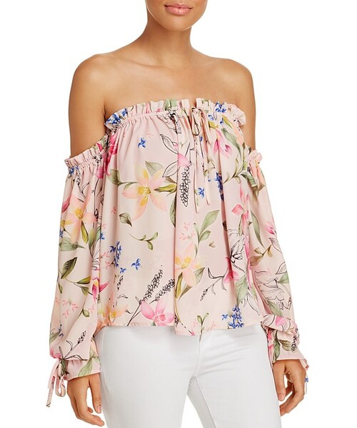 A daring off-the-shoulder silhouette by Yumi Kim exposes a stunning swath of shoulder, softened by a romantic floral print and long, puffed sleeves. Fits true to size, order your normal size Ruffled off-the-shoulder silhouette, keyhole neck with tie closure Long sleeves with tie closures Model measurements: 5'10" height, 33.5" bust, 23.5" waist, 34.5" hips, wearing a size extra small Polyester Dry clean Imported