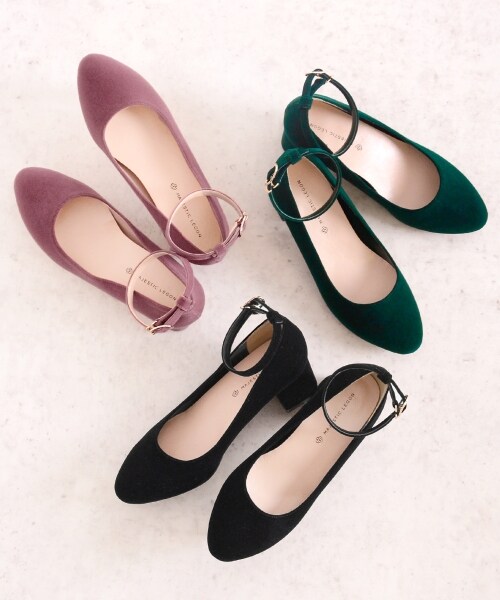 一足持っていると活躍間違いなしの定番ストラップパンプスは足元をとってもガーリーに魅せてくれる優れもの★安定感の良い太めヒールは高すぎず程よい高さになっており、しっかり脚長効果も期待できます!ふっくらインソールとストラップ付で歩きやすいのも嬉しいポイントです◎