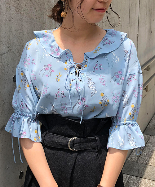 旬な小花柄のブラウスには、袖のシャーリングや胸元のレースアップのデザインポイントがあり1枚で主役級アイテムです。 デニムとの相性もよく、甘くなりすぎないコーディネートで楽しんでいただけます♪襟元デザインもボリューム感がほどよく、小顔効果も◎