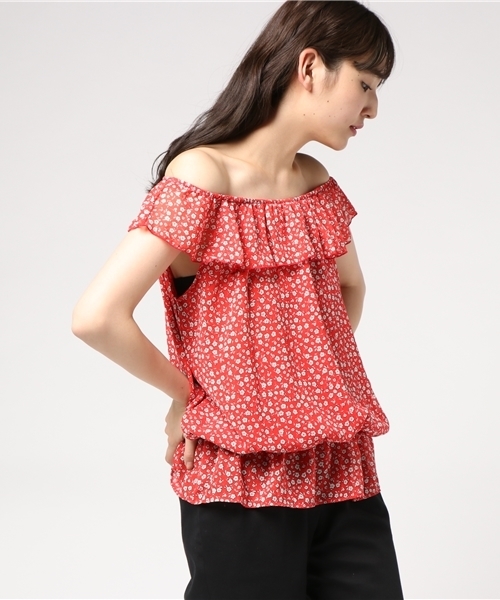 大人気の花柄オフショルブラウスにノースリーブが新登場!!オフショルとしてはもちろん、スタンダードなブラウスとしても使える2WAY仕様☆シャーリングを施しているのでメリハリがついてスタイルが良く見える効果も...♪肌見せでトレンド感をキャッチ!!