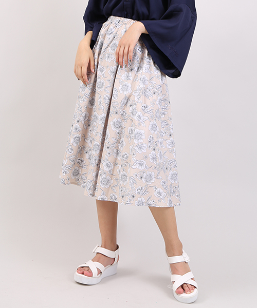 上品な印象を与える花柄を全面にプリント。両サイドにはポケットつき☆ウエスト部分はゴム仕様になっているのでストレスなく履いていただけます。