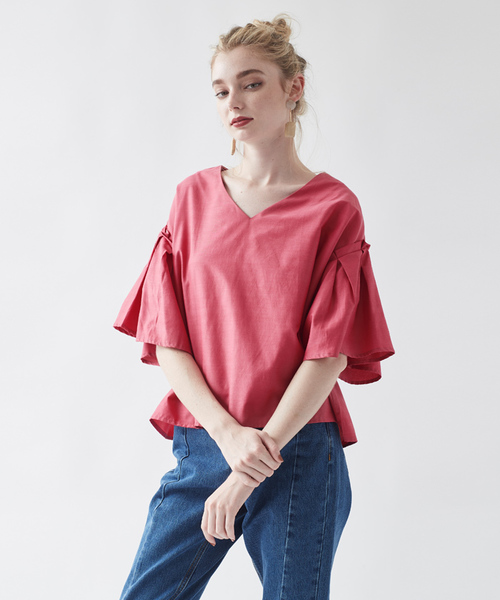 程よくボリュームがあるタックスリーブがトレンド感あふれるブラウス。Vネックでデコルテを綺麗に見せてくれます。ドロップショルダーが華奢見せ効果も!シンプルで合わせやすく、今年らしい丈感で手軽に旬を取り入れるのに最適な1枚です。